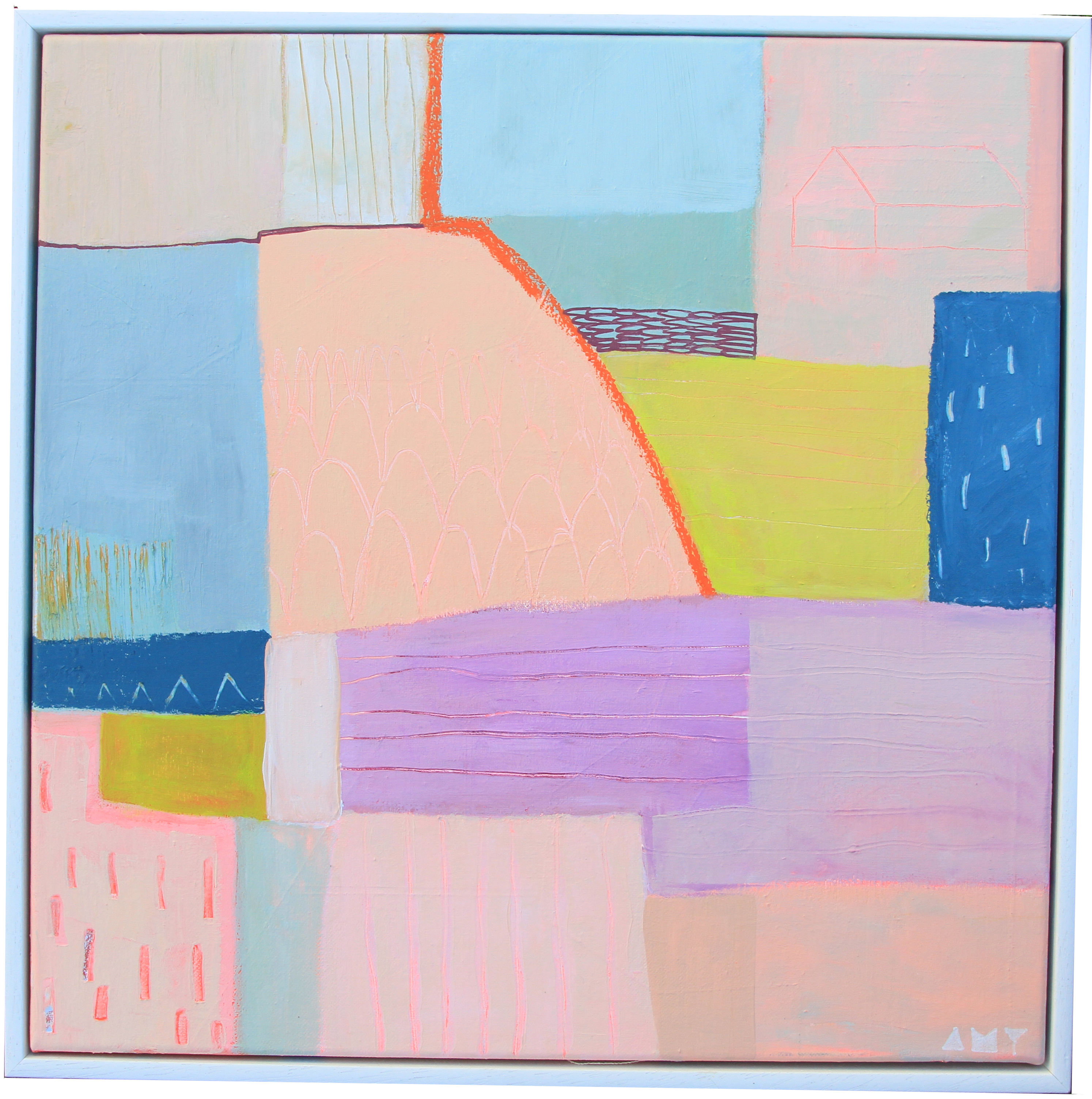 This is a framed original acrylic and soft pastel piece on canvas. The beauty and complexity of the patterns on the land as seen from an aerial viewpoint is what inspires this body of work. Old Irish stone cottages, now often seen abandoned in the Irish countryside appear frequently in Amy’s work. The history of these houses and the romance of speculating about who once lived there and what their lives looked like, living in such a beautiful yet remote place, intrigues Amy.