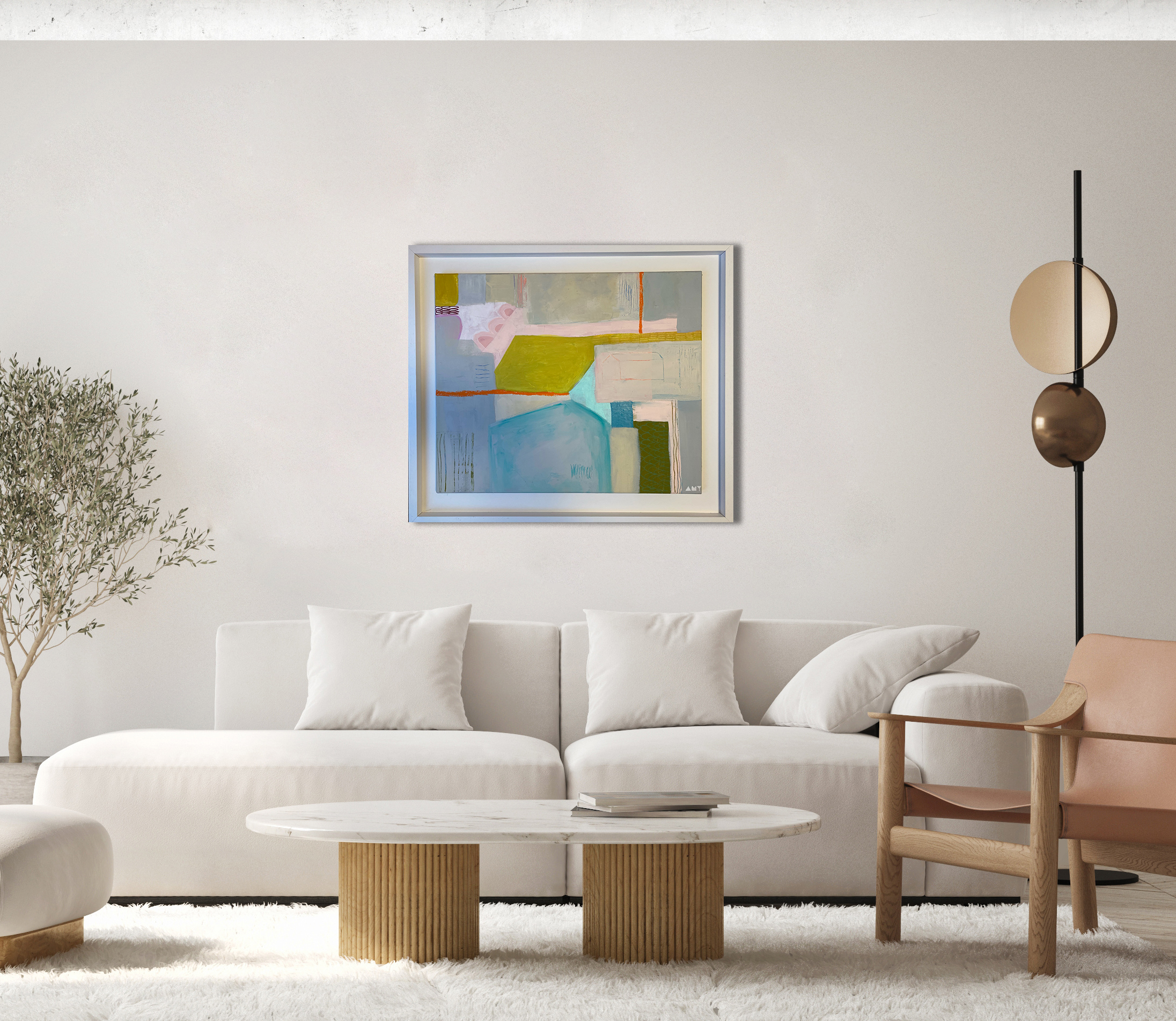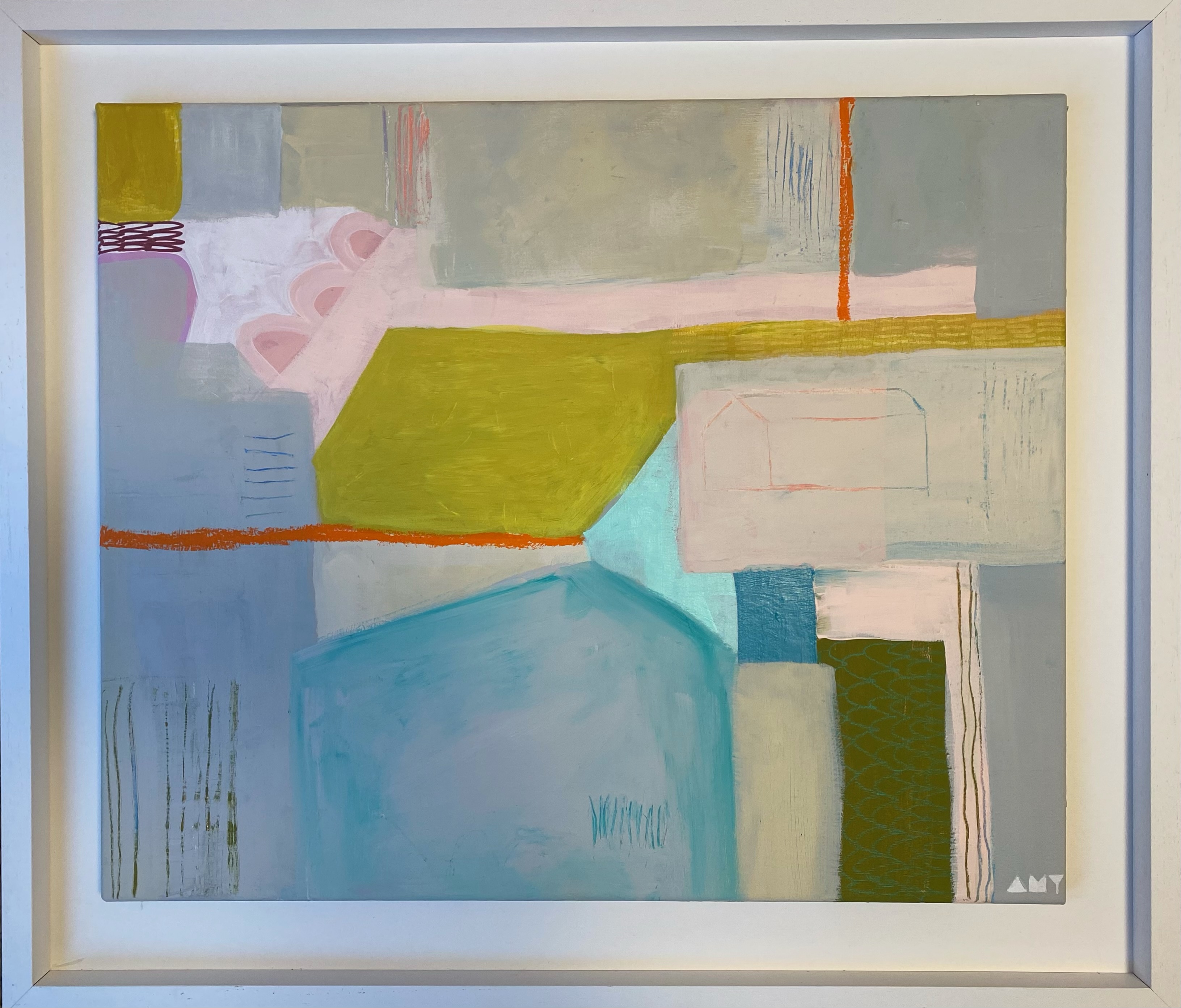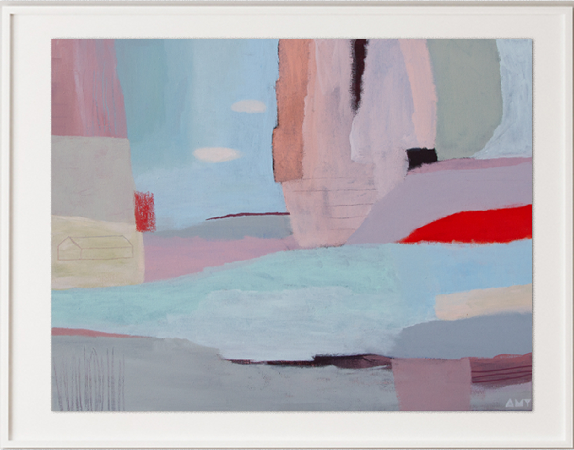 This painting is framed simply in a white handmade solid wood frame.