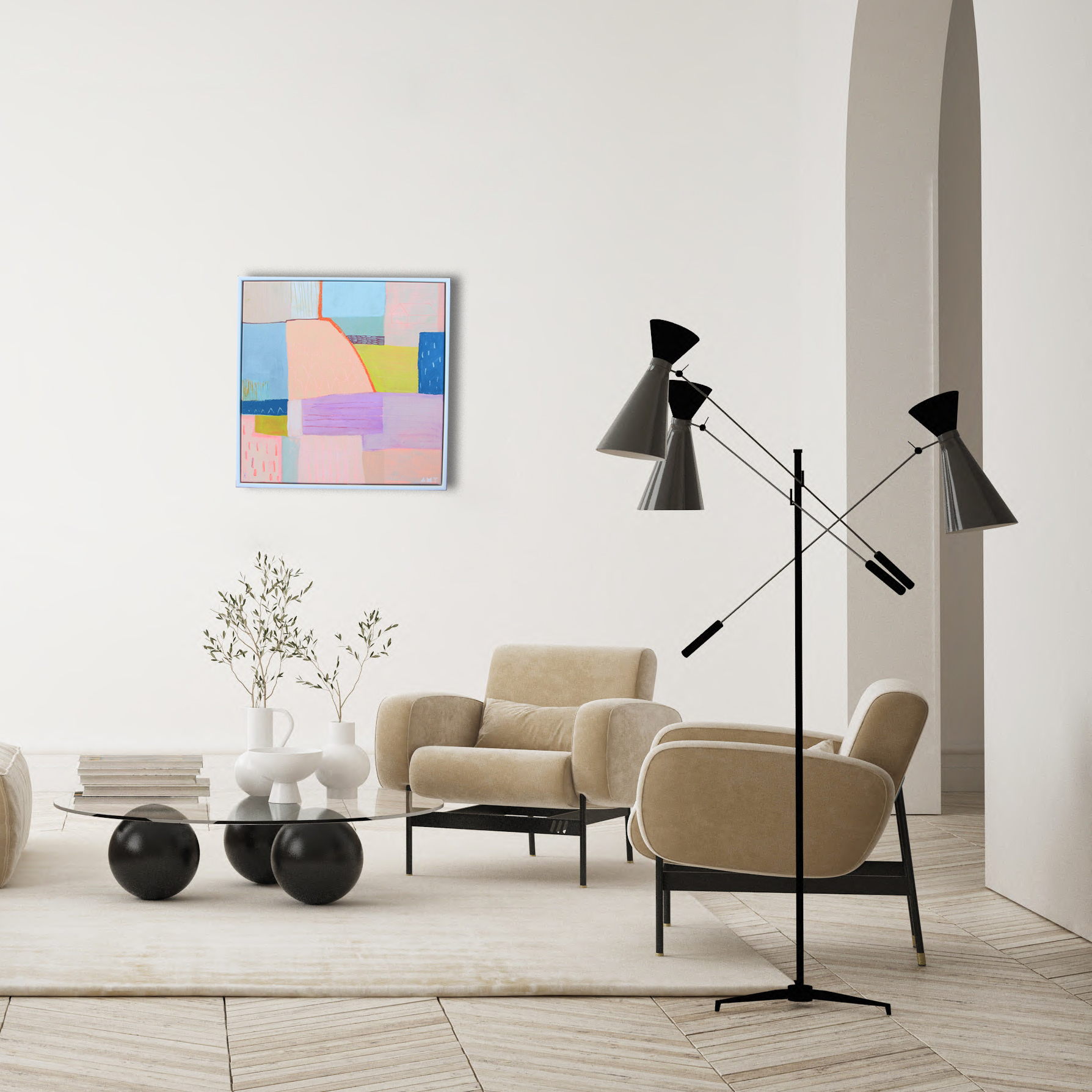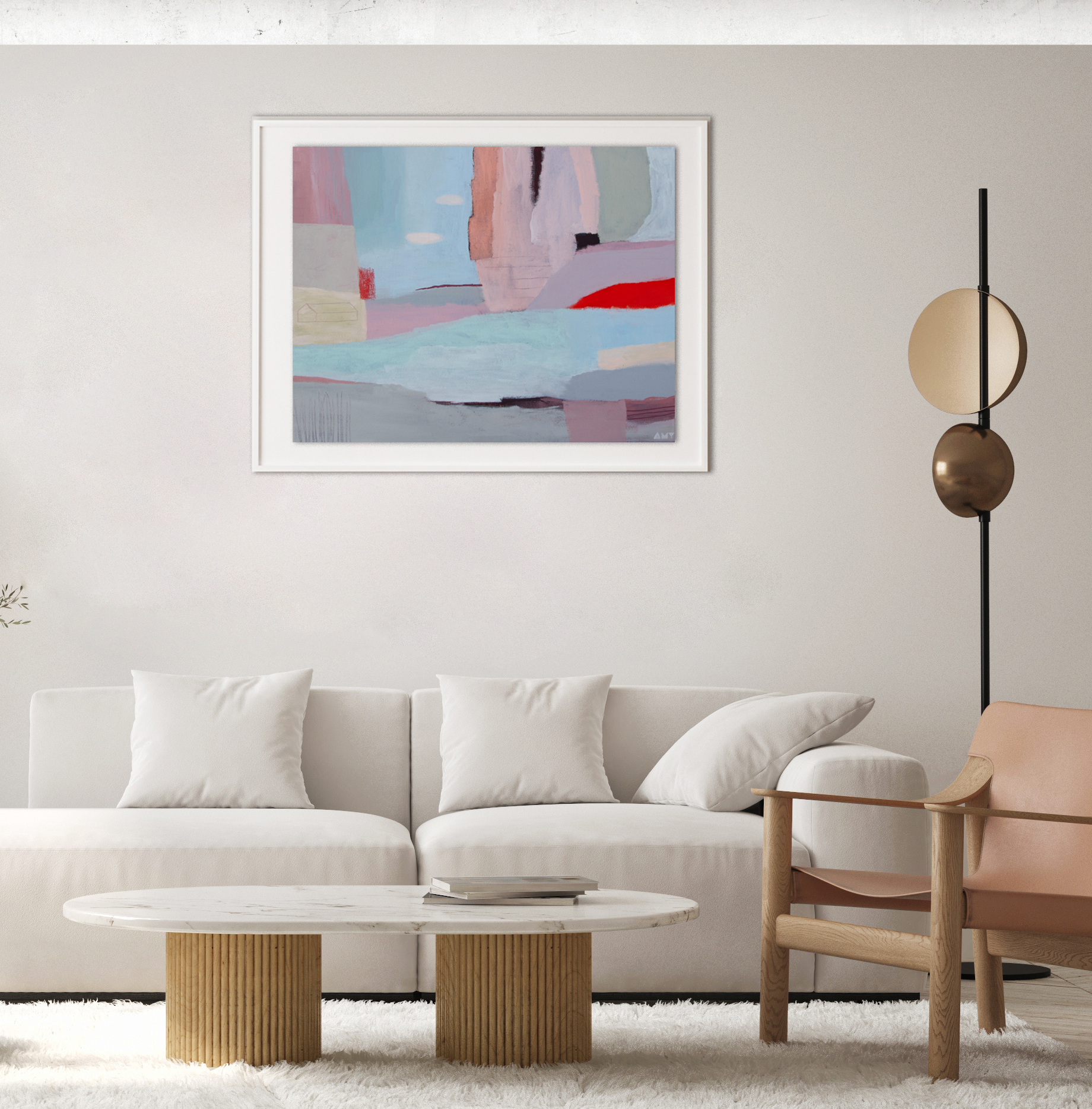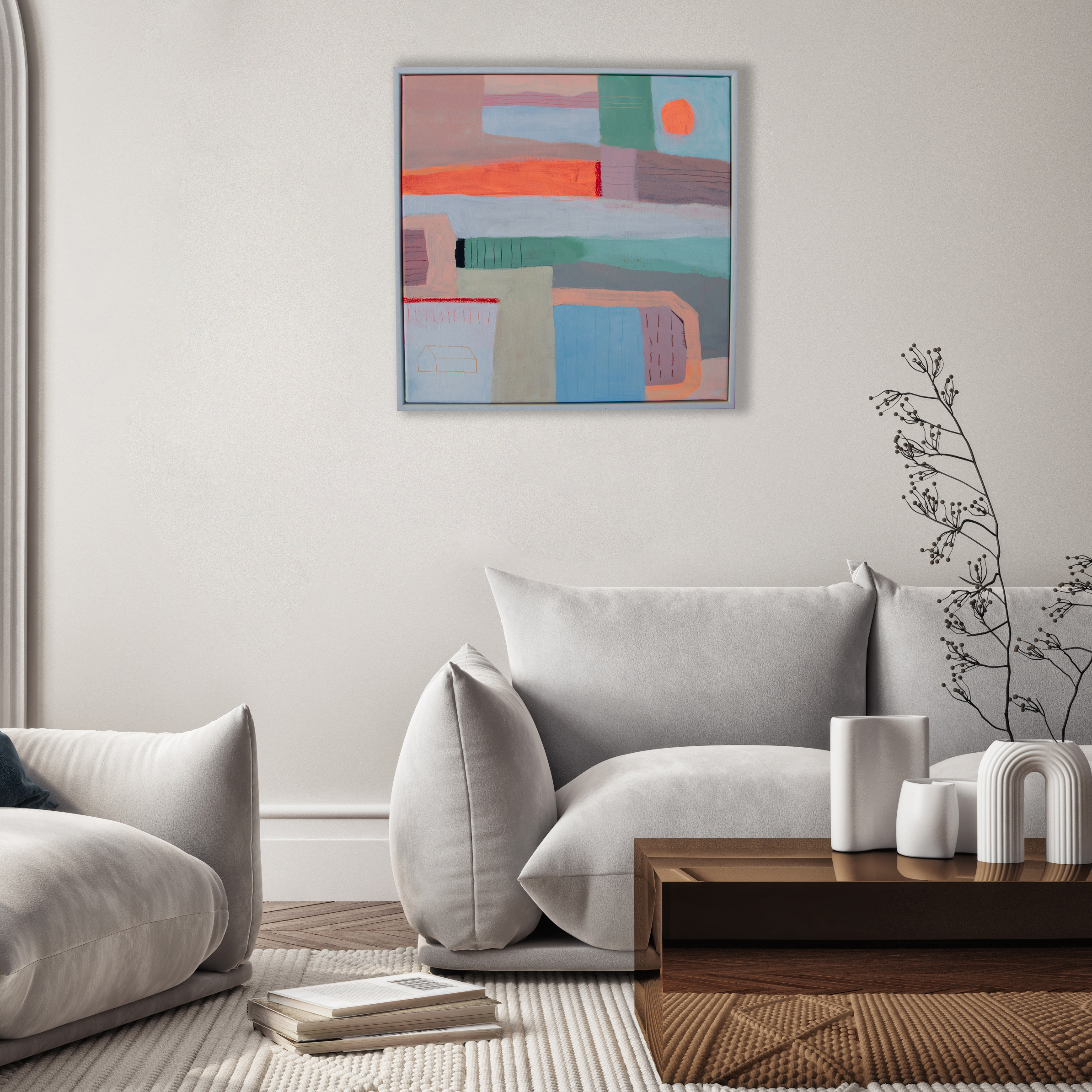 This painting is framed simply in a white handmade solid wood frame.