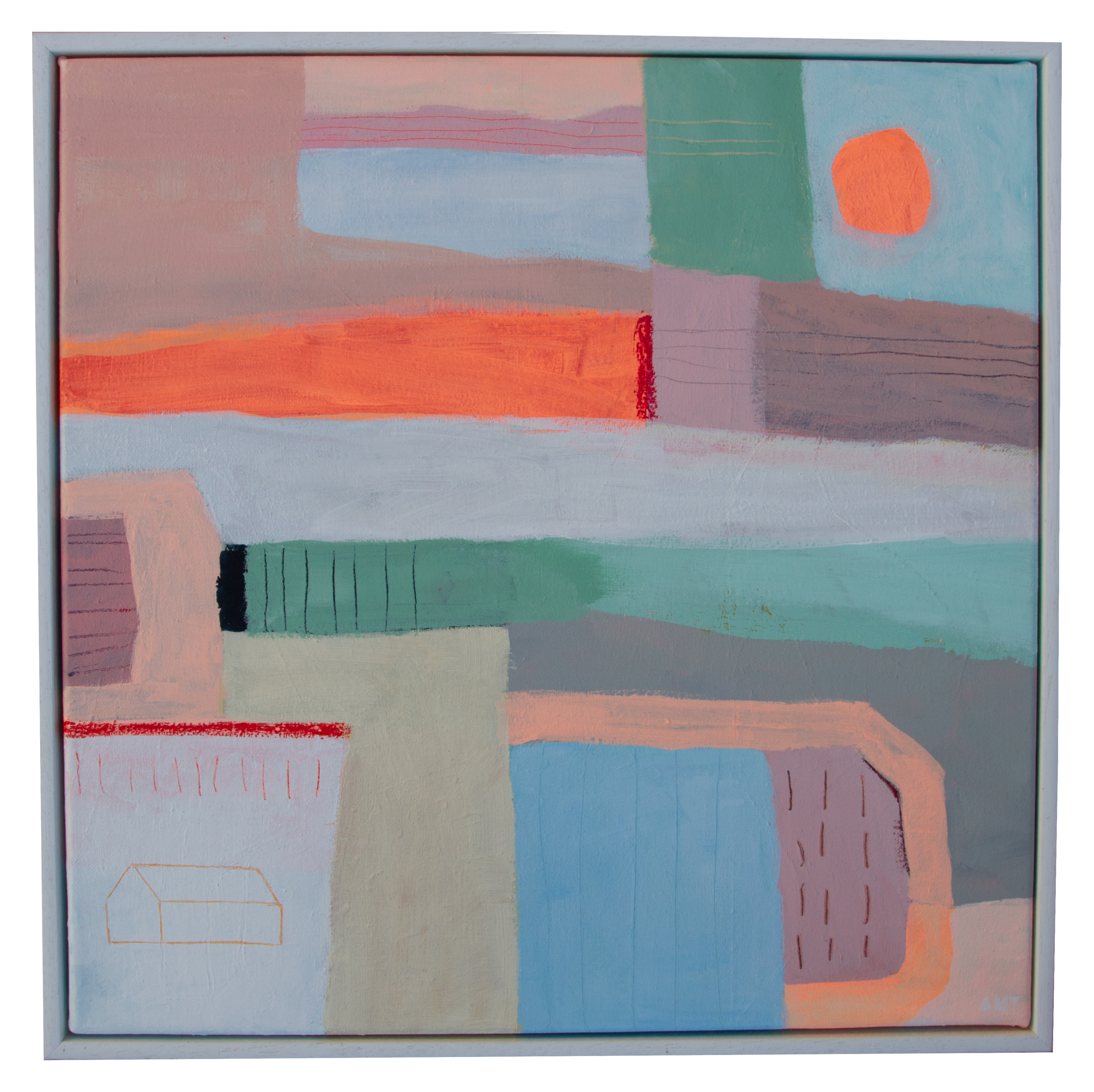 Measuring Width 30cm x Height 30cm. Total measurement is 44cm x 44cm including frame. Signed, dated and titled on the back of the canvas.